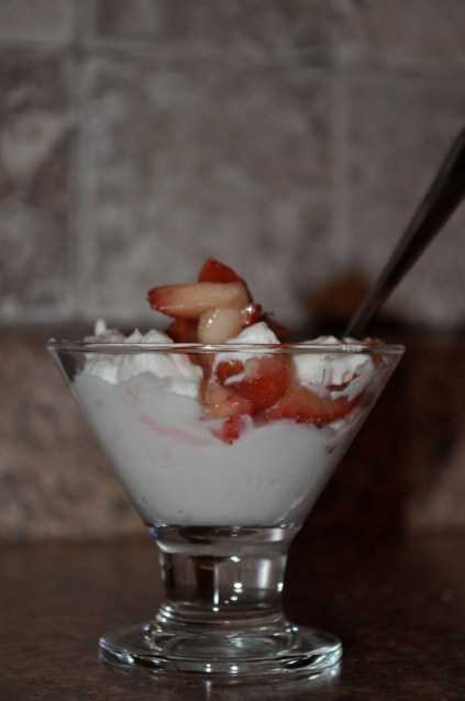 Layer whipped cream with the crumbled meringue mixed in (I whipped about 16 ounces & added three tablespoons of sugar to it), with sliced strawberries, another layer of whipped cream and then top with strawberries.