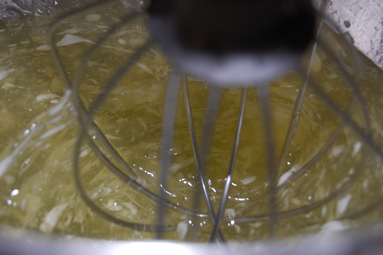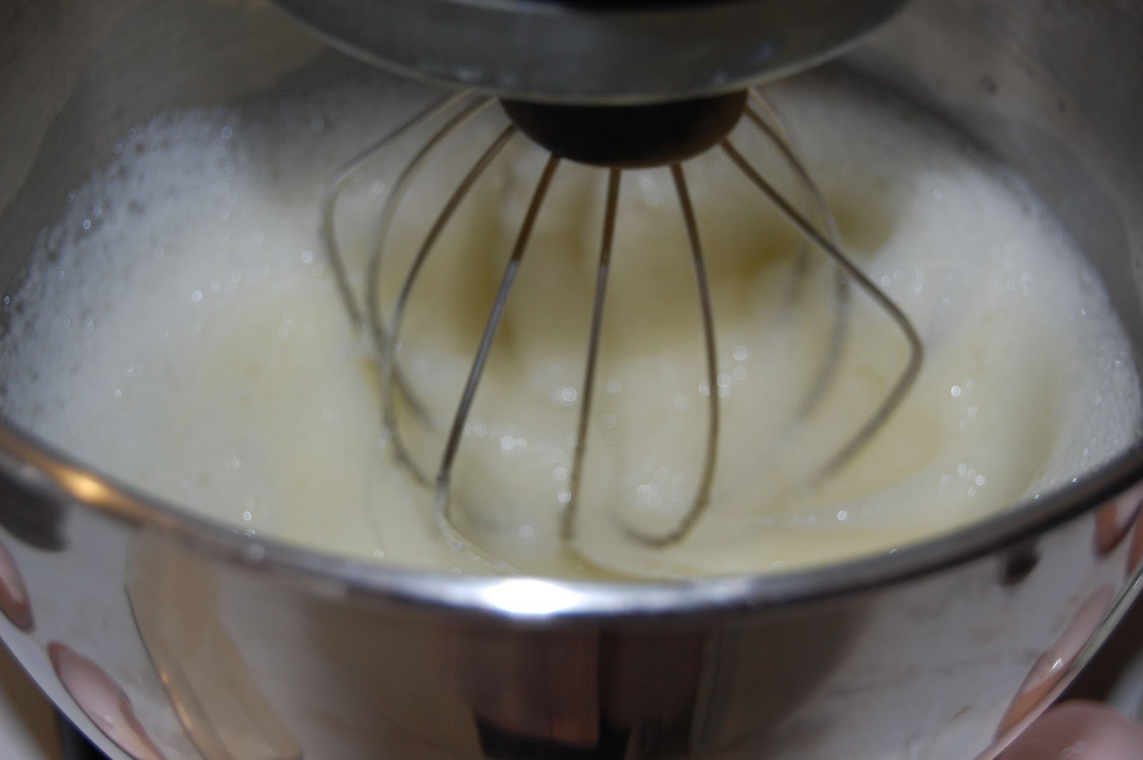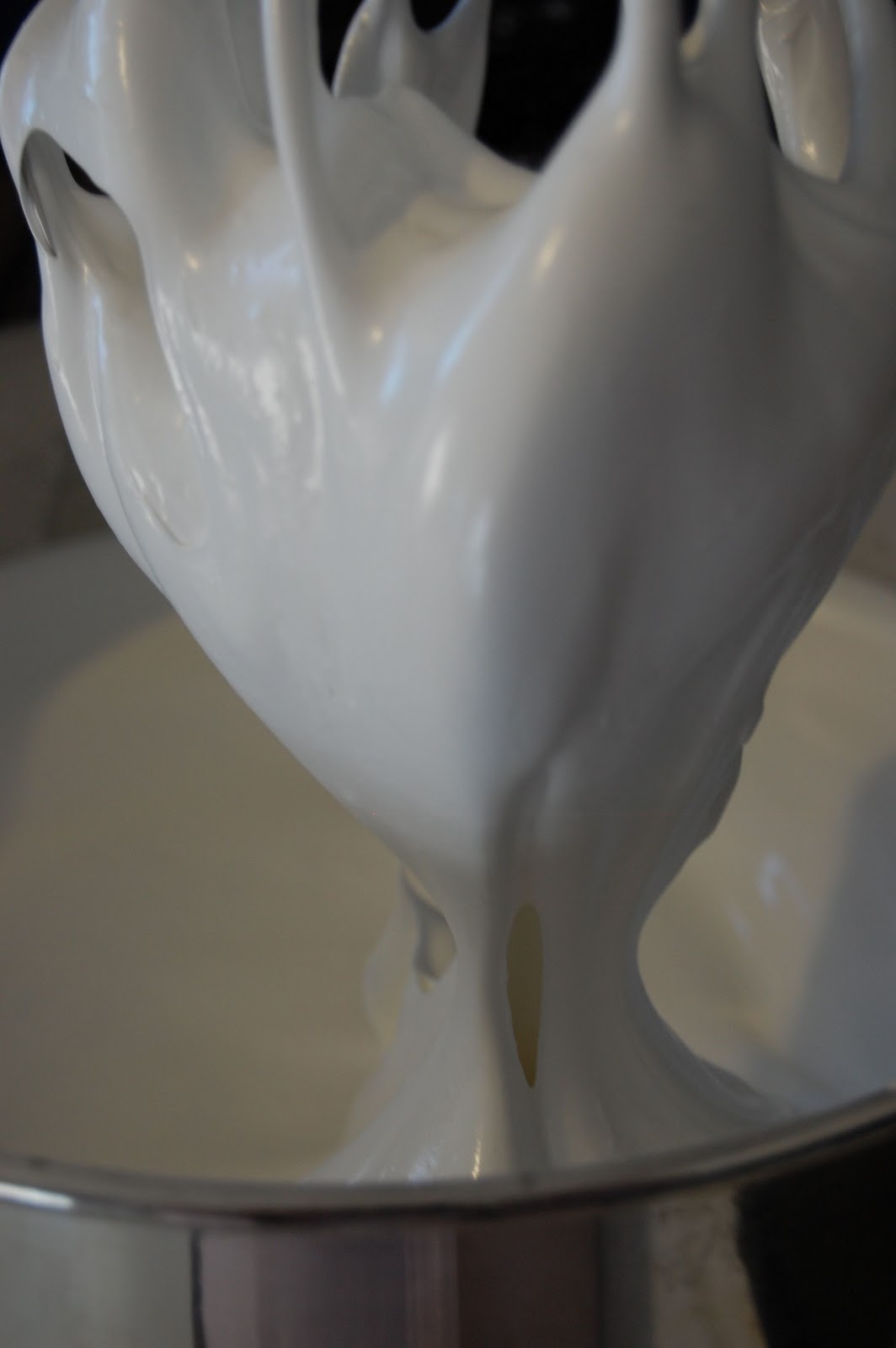 Whip on high speed for about ten minutes or so as they will become frothy and eventually take on a beautiful whipped look. At this point gradually fold in your sugar, and if you are coloring your meringues a drop or two of your color.