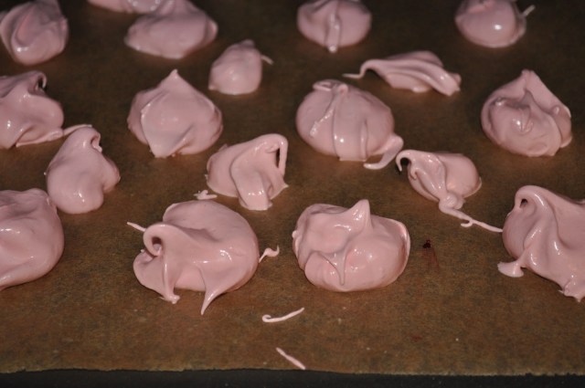 When you whites are stiff and can stand alone, take spoonfuls of the meringue and glob onto parchment lined baking sheets. They don’t have to be perfect.