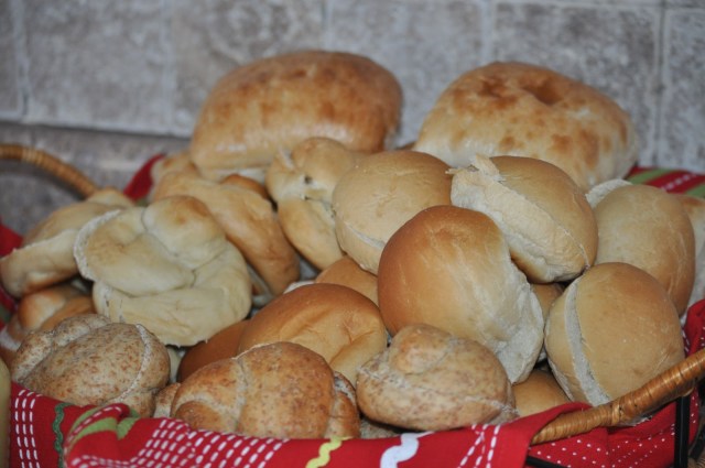 Wheat, sourdough, yeast & ciabatta rolls for a variety of flavors look lovely in a basket lined with a colorful towel.