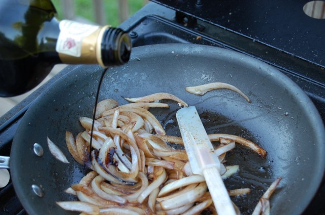 With about ten minutes of cooking time left, add about 2 Tablespoons of Balsamic vinegar and cook until the vinegar has completely dissolved.
