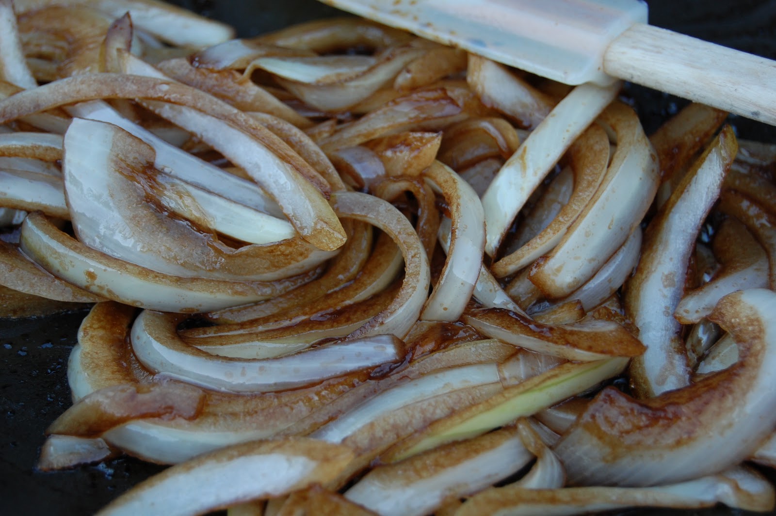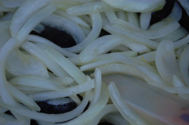 Take a large sweet onion and thinly slice it.  Pour a splash of olive oil in a sauté pan and add your onions.  Cook on medium heat until transparent and cut to low.  Let cook for about 20 minutes, stirring occasionally.