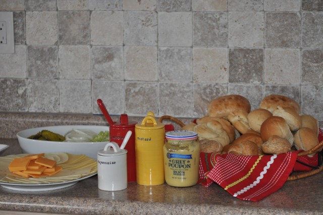 Setting up for a burger buffet is quite simple.  We used an assortment of rolls for buns and made all of the patties small in the style of the popular sliders.