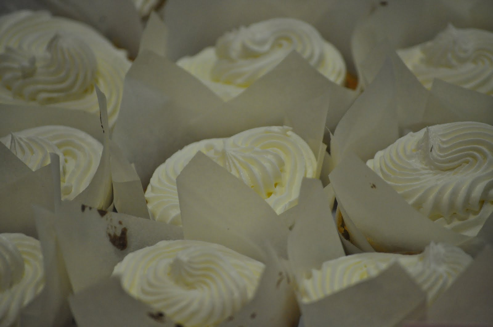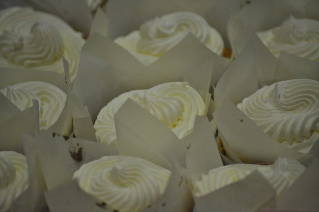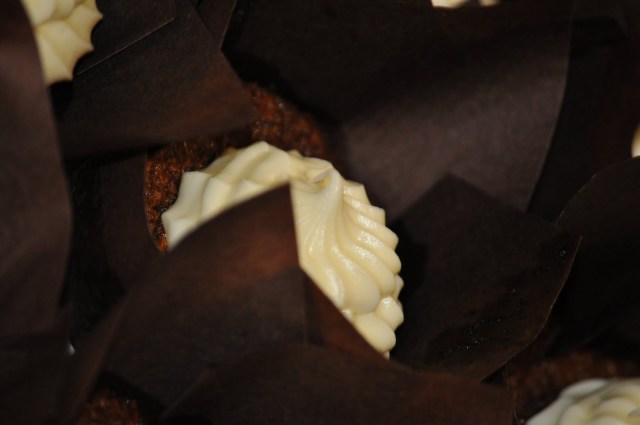 | tasting the gluten-free miniature carrot cake cupcakes. |