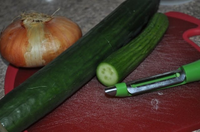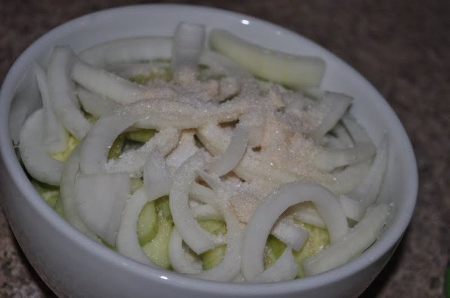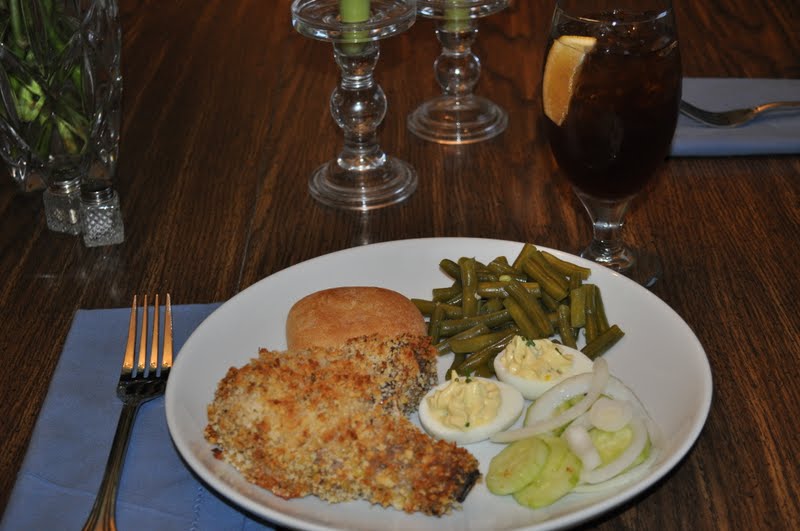 To accompany our meal? I served up fresh green beans, deviled eggs, marinated cucumbers with onions and a whole wheat roll. No fried pickles here (and oh how I adore them!). I took a large English cucumber, peeled and sliced it, sliced Vidalia onion ring and then marinated them in rice vinegar and 1 tablespoon of sugar for an hour.