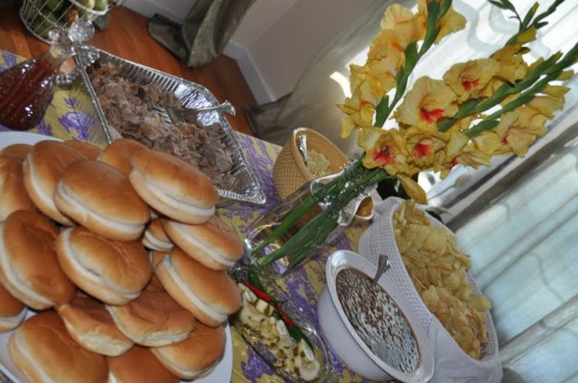 I set up everything buffet style on a simply decorated table, arranging the food (except the BBQ) in bowls and platters for a personal touch.