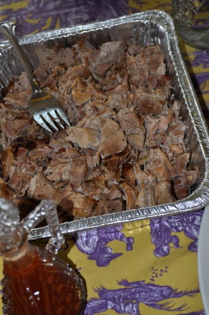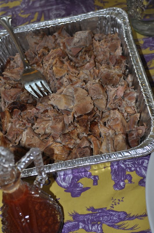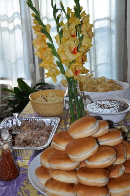 Audley is the king of the grill, but I didn’t want him cooking his own birthday dinner, so I called our favorite BBQ place, Aunt Beas, and ordered up eight pounds of chopped bbq and their famous mustard slaw to be picked up an hour before guests were to arrive.