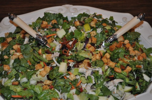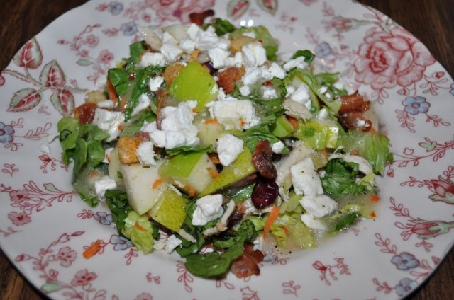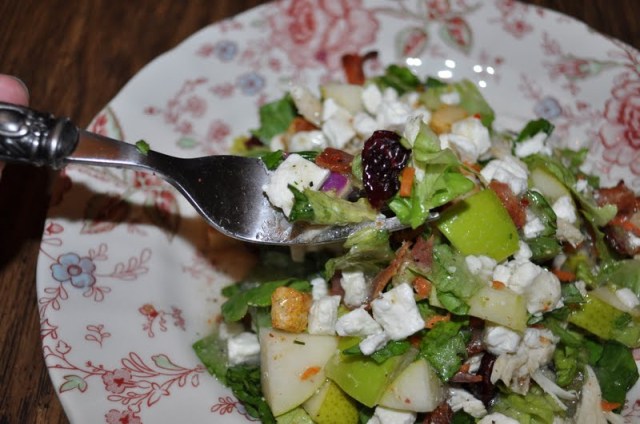 For this autumnal salad you need 2 bags of romaine lettuce (chopped); 1/2 of a rotisserie chicken, diced; 1 large granny smith apple, washed and diced; 2 barlett pears, washed and chopped; 1/2 cup dried cranberries, 3/4 cup chopped crispy bacon; feta cheese; croutons if desired.