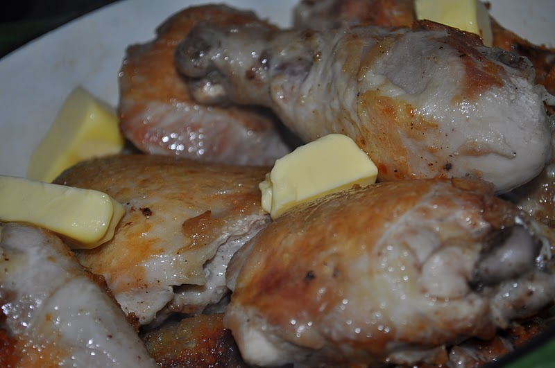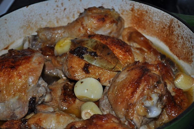 Add 1 tablespoon of the butter to the skillet and swirl to coat the chicken.  Turn the chicken skin side up and add the garlic and bay leaf.