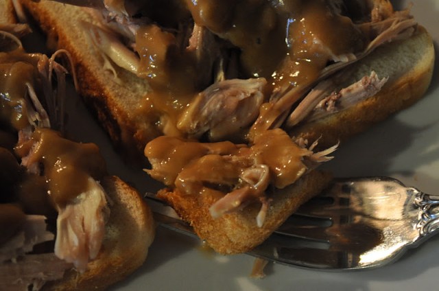 Maybe it was because the flavor of the delicious basting juices (white wine and chicken broth seasoned with fresh herbs) for the turkey were preserved in my senses, or perhaps it was because I didn’t have any ground sirloin for a good hamburger & I didn’t want to drop what I was working on around the house to brave Black Friday traffic, but I gave in and decided to eat the leftover turkey.