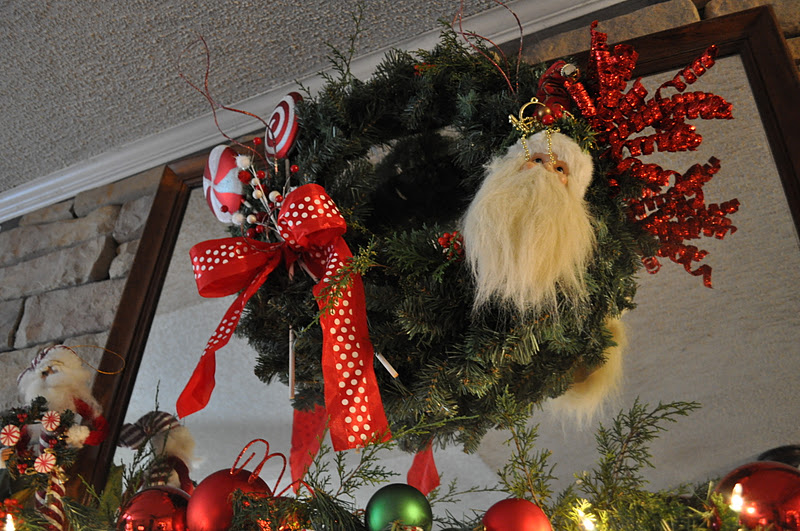 This to me is Christmas perfection! I love the garland with the giant red ornaments, and the candy in the wreath. It's beautiful! Merry Christmas!