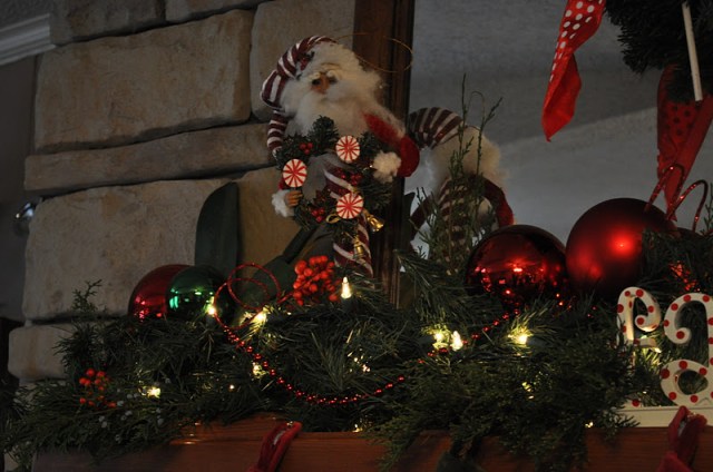 For the mantle I included a Santa who has many miles (and several states) on him.  We bought him eight years ago and since then he has lived in Iowa, Alabama, and Georgia (& soon South Carolina!) for memorable Christmas celebrations.  I would love to hear his version of our silly holiday antics!