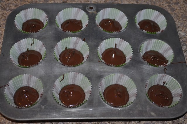 For the peanut butter cups, line 24 miniature cupcake pans with foil liners.  Melt about 16-ounces of milk chocolate and add about a teaspoon of chocolate to each liner.  The chocolate should cover the bottom.  Place in the refrigerator to harden.