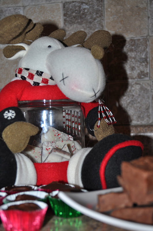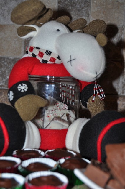 Here I took a canister that I found at Dollar General decorated up like a reindeer and began filling it with peppermint bark, peanut butter cups and mint fudge.