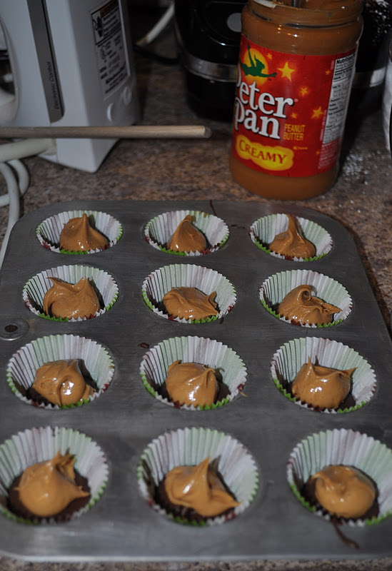 Removing the chocolate from the refrigerator, spoon just a small amount of peanut butter into each cup.