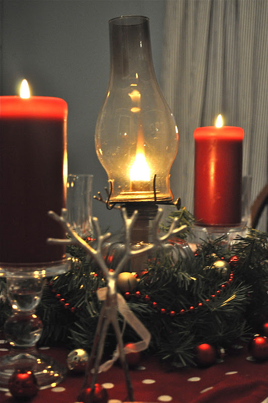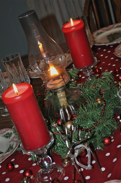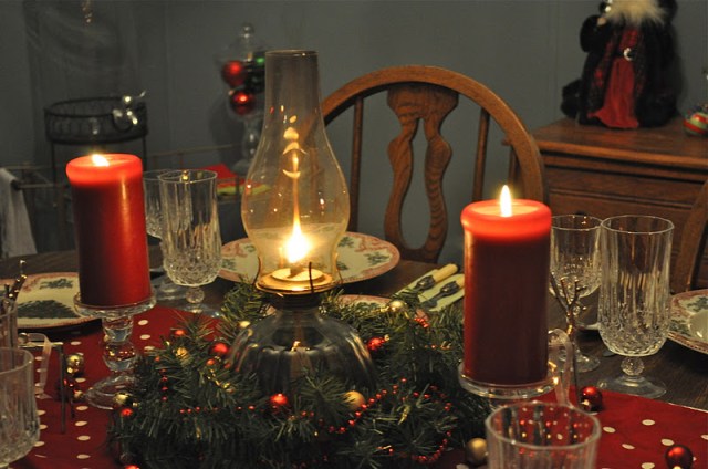 For a centerpiece, I also went for function. I saw no need to fill the entire table with decoration, especially since my 11 year old will want to move stuff around and play when he thinks we aren’t looking. I took an antique oil lamp, surrounded by garland and decorated it with beads and glass ornaments. The pillar candles added just enough glow to create an old-fashioned ambiance. I love the glow of candlelight. It is so peaceful.