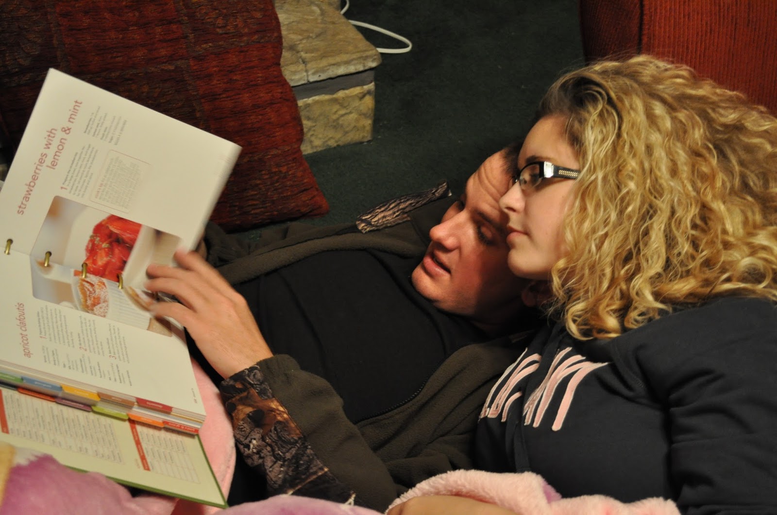 | Justin looking through Samantha’s first cook book showing her all the things he wants her to cook for him! |