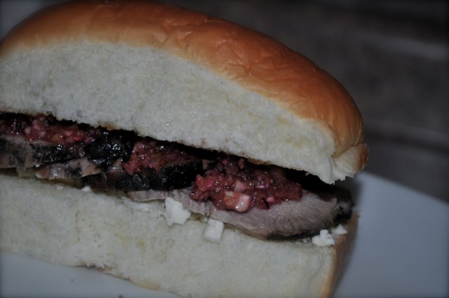 The second sandwich I made was also on a Hawaiian sweet roll. I added a few blue cheese crumbles (which are strong, so use sparingly) and topped the tenderloin with cranberry relish.