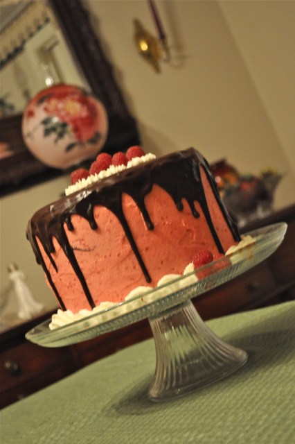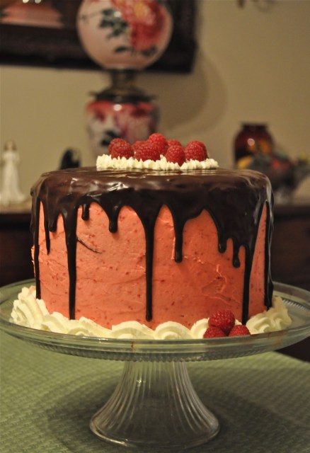 The raspberry buttercream recipe can be found here. I did learn that if I were to make this cake again, to add a bit extra raspberry flavoring and leave out the raspberry puree if adding the chocolate ganache. Although filling the cake with icing containing the puree would be fabulous!