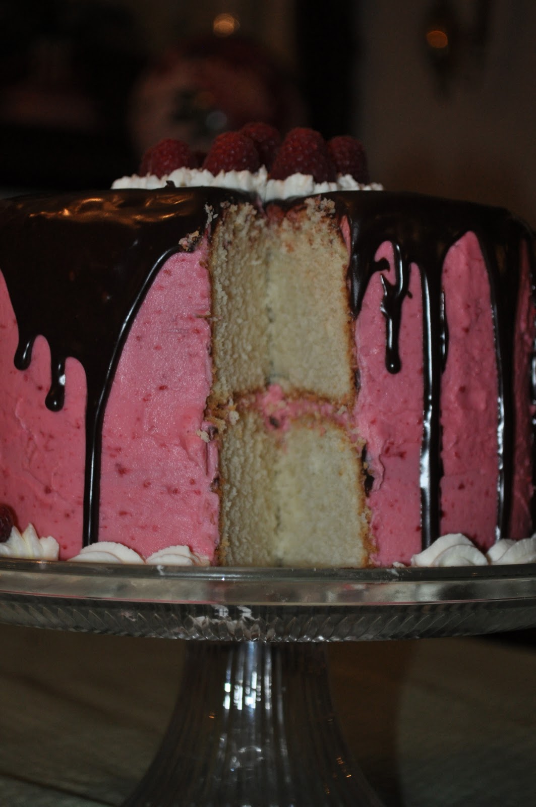 The raspberry buttercream recipe can be found here. I did learn that if I were to make this cake again, to add a bit extra raspberry flavoring and leave out the raspberry puree if adding the chocolate ganache. Although filling the cake with icing containing the puree would be fabulous!