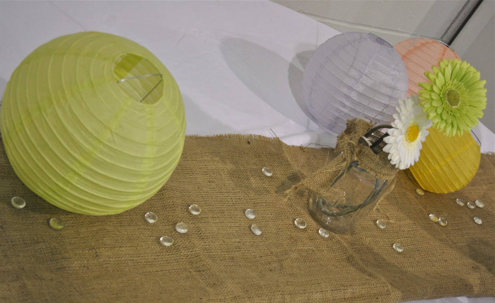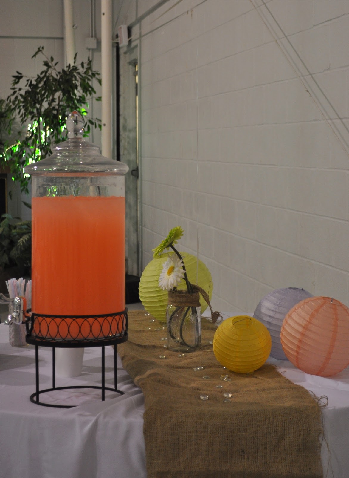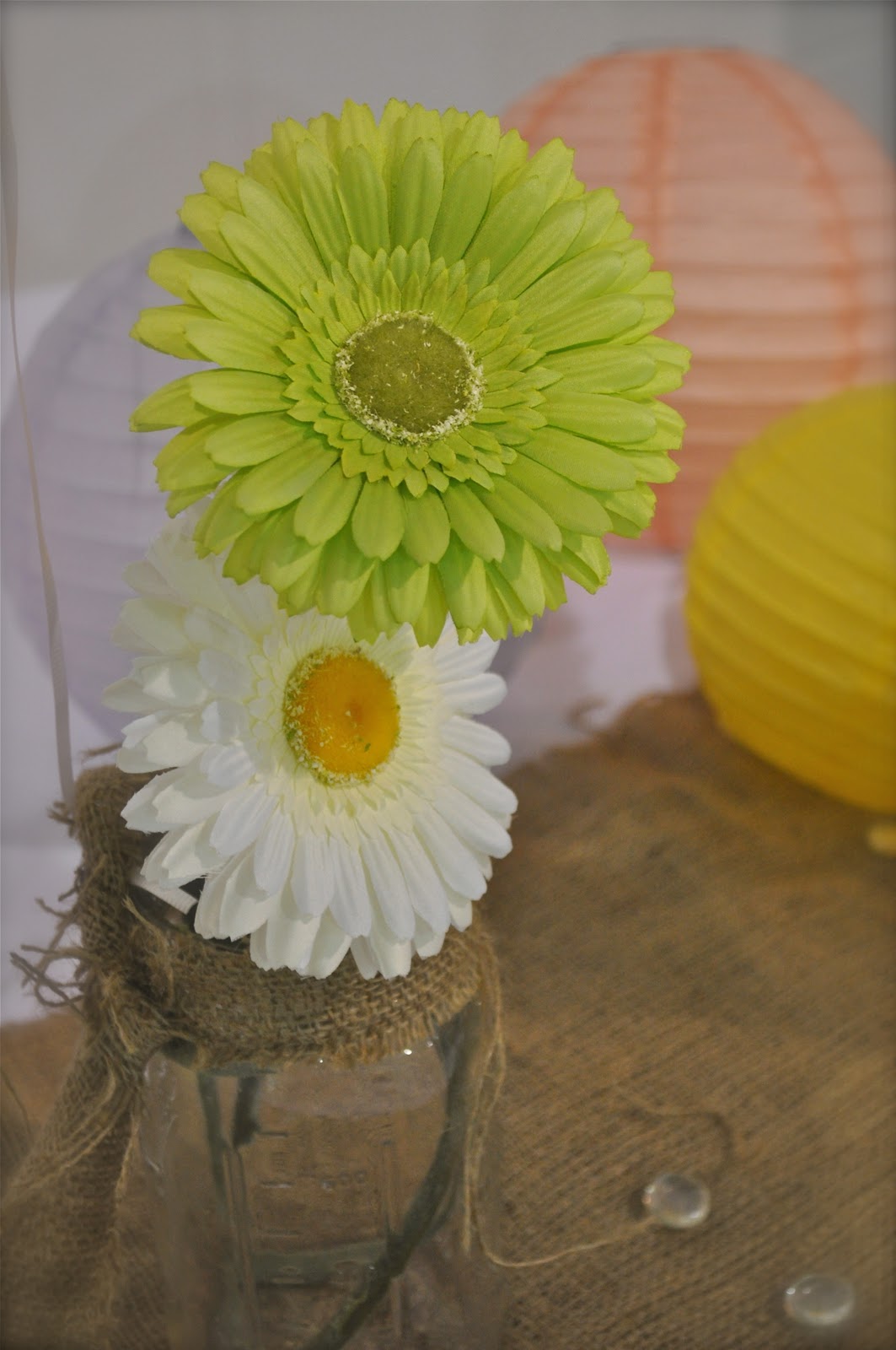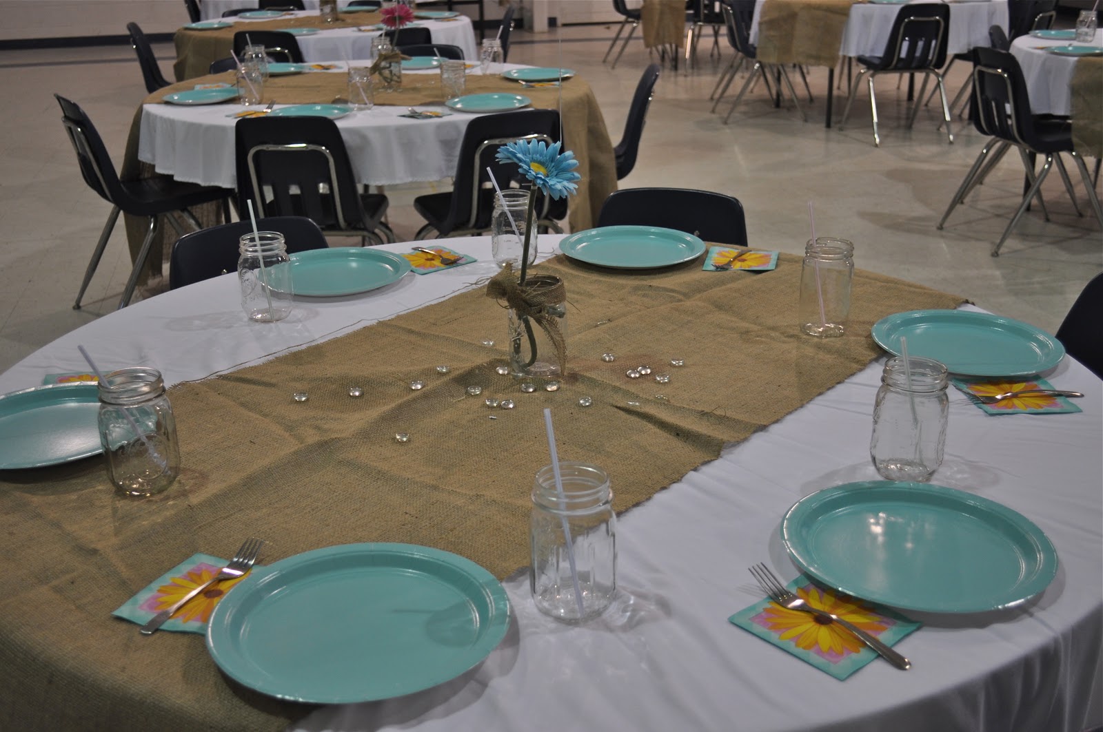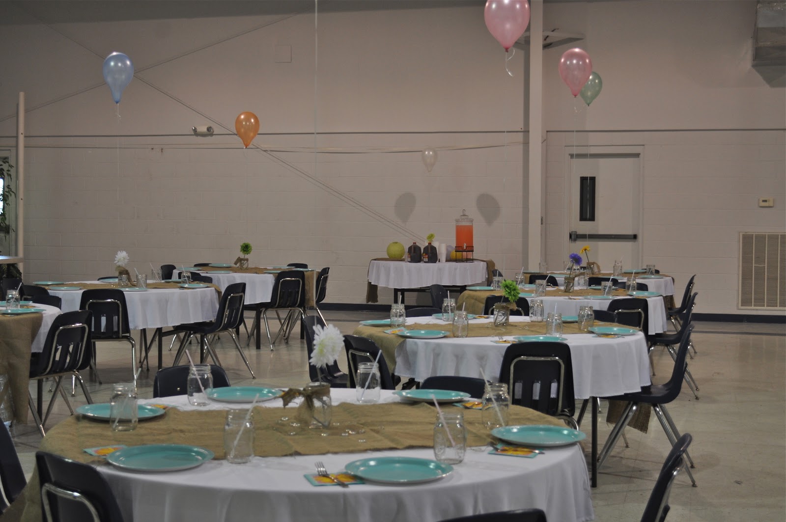 Tablecloths were available for the tables, so we topped them with burlap we already had to keep it from looking so formal.  I raided my stash of canning jars to use for vases as well as drinking glasses.  My only expense were the paper plates, napkins, balloons, and faux daisies.