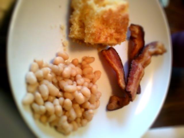 Last night MacKenzie and I attended a spring entertaining demo in Atlanta presented by Eddie Ross. Audley, Madeline and Bradley remained at home; working in the yard and hanging out. I started supper before we left, putting on a crockpot of Navy beans and laying out the remainder of ingredients to make cornbread.