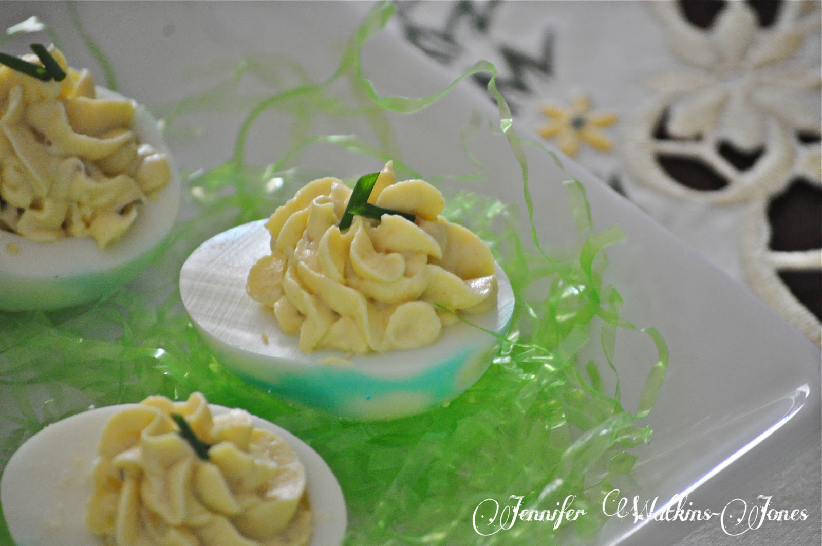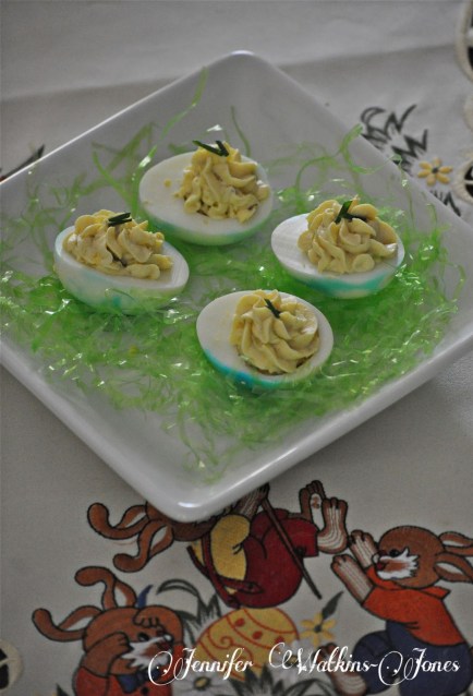 **I don’t have a picture for these, but my dear friend, Jane Dawkins,  suggested that you mix a small can of deviled ham with the egg yolks, mayo and pickle relish. It makes pink, tasty deviled eggs!