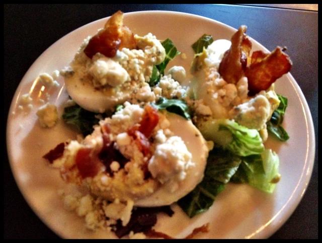 Maytag Deviled Eggs served at The Lodge at Copperhead in the North Georgia Mountains. Eggs topped with Blue Cheese and Bacon”  There is also pickle juice and dill in the filling.