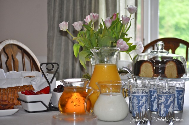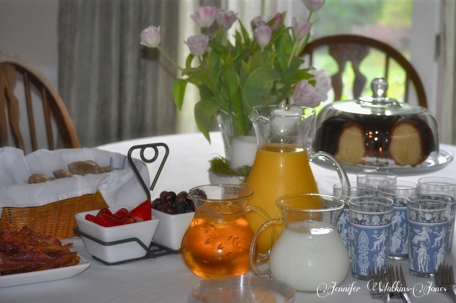 Breakfast is one of my favorite meals to prepare, although I often despise getting up so early to cook! It’s easy to plan in advance when you know your guest’s likes and dislikes.  For our weekend breakfast, I went simple:  fresh fruit, pound cake, mixed berry muffins, and (for those who like something hot) crisp bacon.
