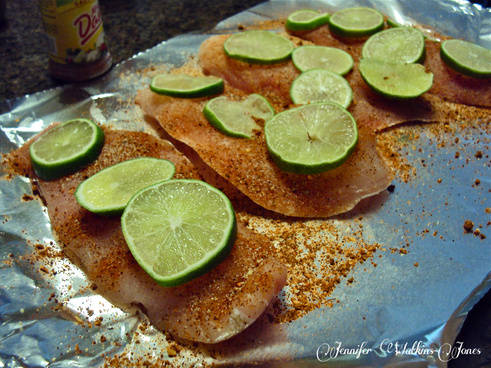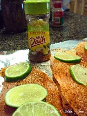 Lay out the four fillets on aluminum foil or on a broiler pan. Generously season with the Mrs. Dash seasoning. Audley likes a little black pepper on his as well. Top each of the fish fillets with the slices of lime. Squeeze any leftover lime juice over the top.