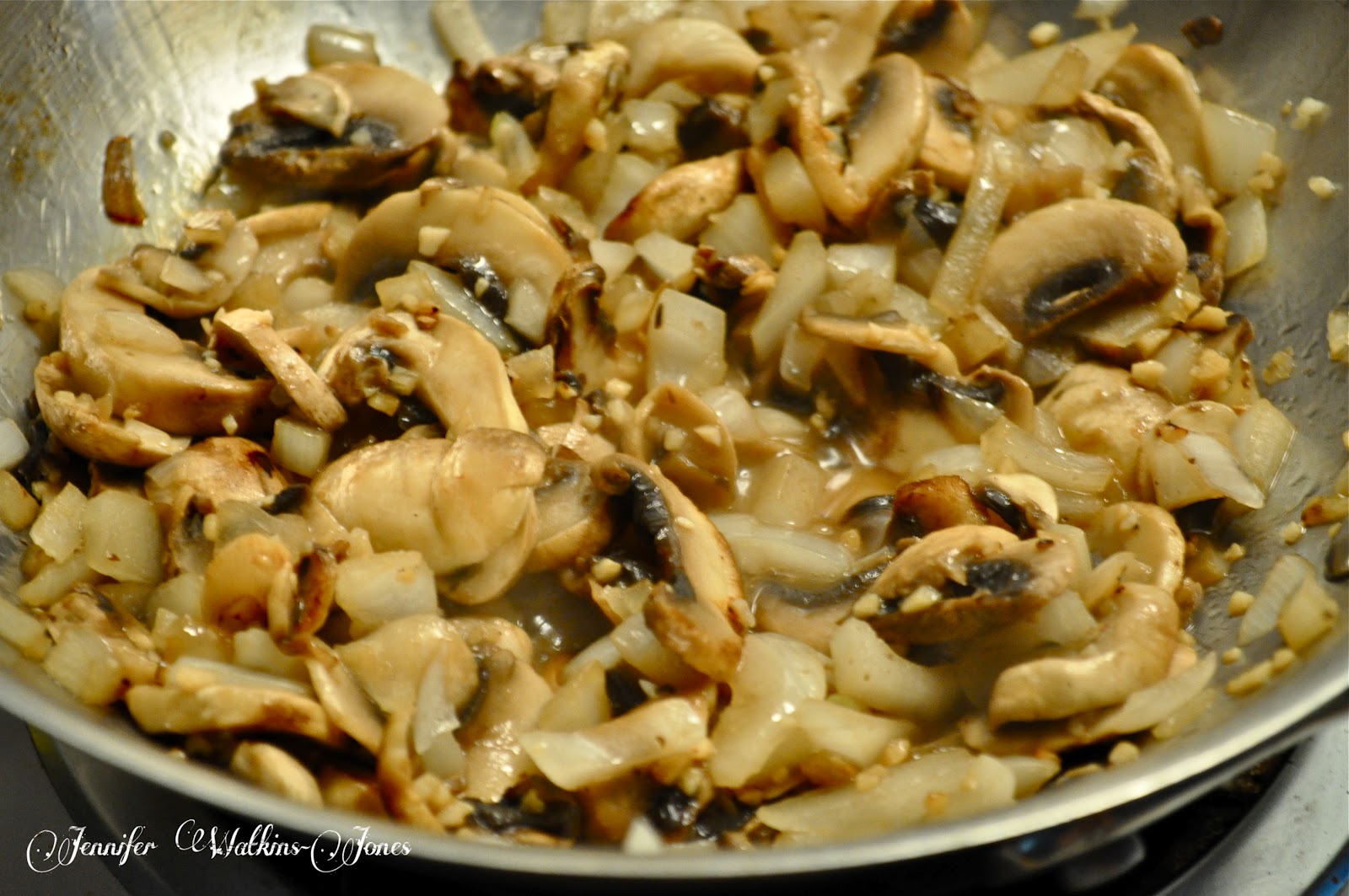 While the pasta is cooking, in another skillet, heat oil over medium heat. Add the red onion, mushrooms, and garlic, sautéing until fragrant.