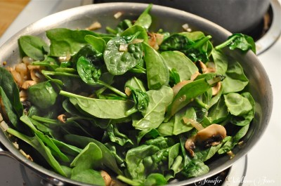 Stir in the basil and pepper. Add the spinach an cook until it is just wilted.