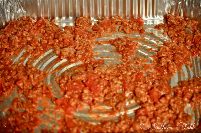 Using a 9×13 pan, spread about 3/4 cups of the meat and tomato mixture across the bottom of the pan (this will help keep the noodles from sticking to the pan). It doesn’t have to cover the whole pan, just give a base.