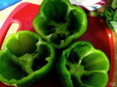 Clean out your bell peppers of seed and the membrane so that you have a hollow “bowl” which to stuff. Set aside.
