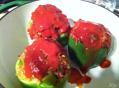 Cover and bake at 375 degrees about 20-30 minutes. I like my peppers to remain crisp, but heated through, so I left mine in about 20 minutes. You will also want to cook this longer if you prepped the ingredients head of time and they are cold.