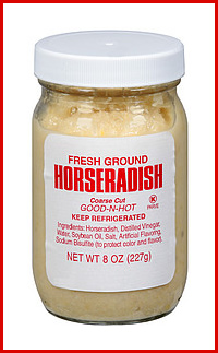 Easy peasy, I whisked together 1/4 cup of Chobani Greek yogurt and 1 Tablespoon + 1 teaspoon of fresh ground horseradish. (This is definitely more or less according to your taste; horseradish is very stout!)