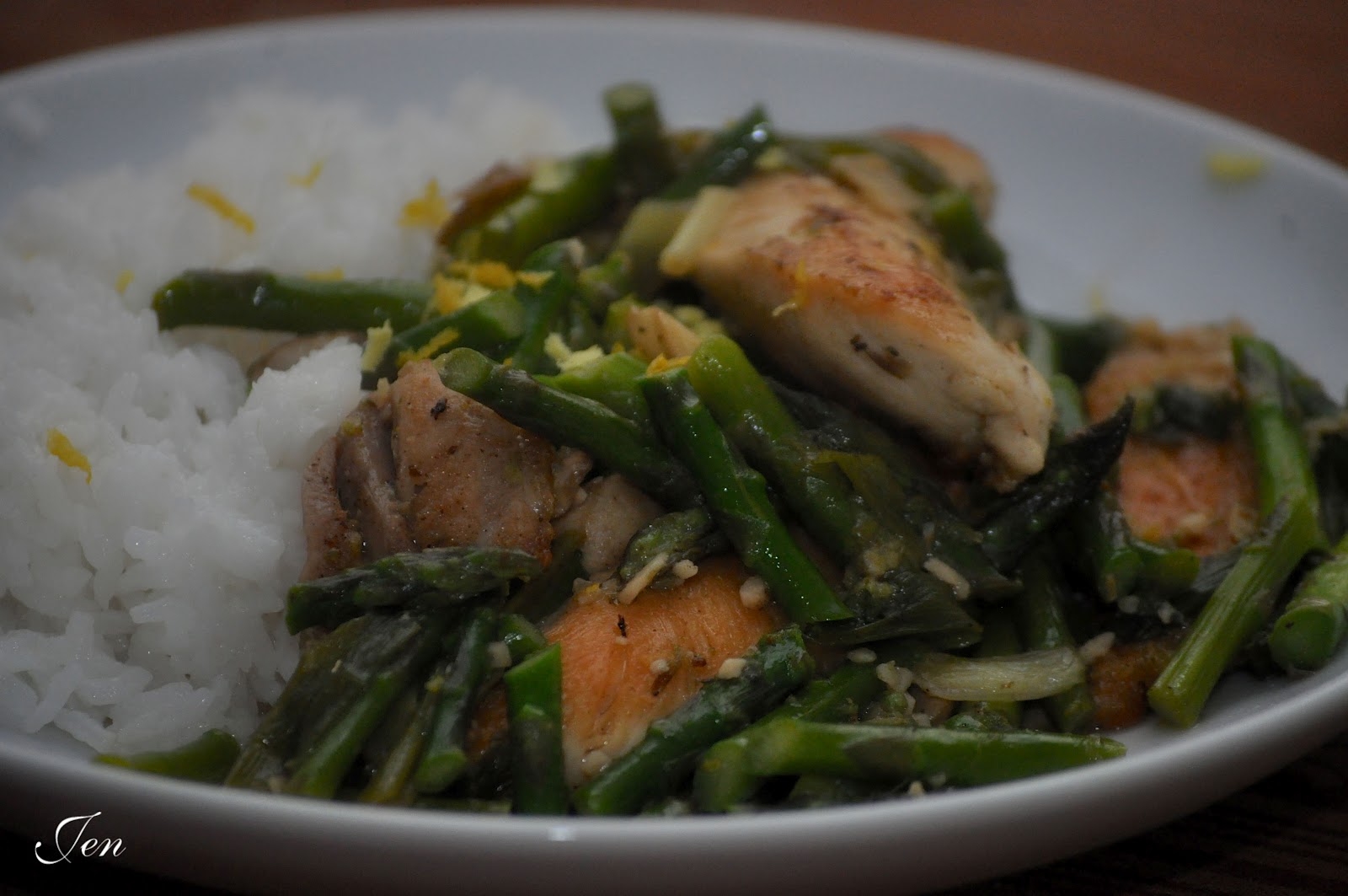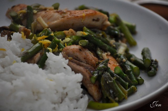 We’ve been so busy this week, that I really hadn’t paid that much attention to my ever shrinking veggie supply in the refrigerator. When dinner rolled around yesterday evening I realized my options were limited; I had salad fixings, asparagus, a couple of lemons and a few onions.