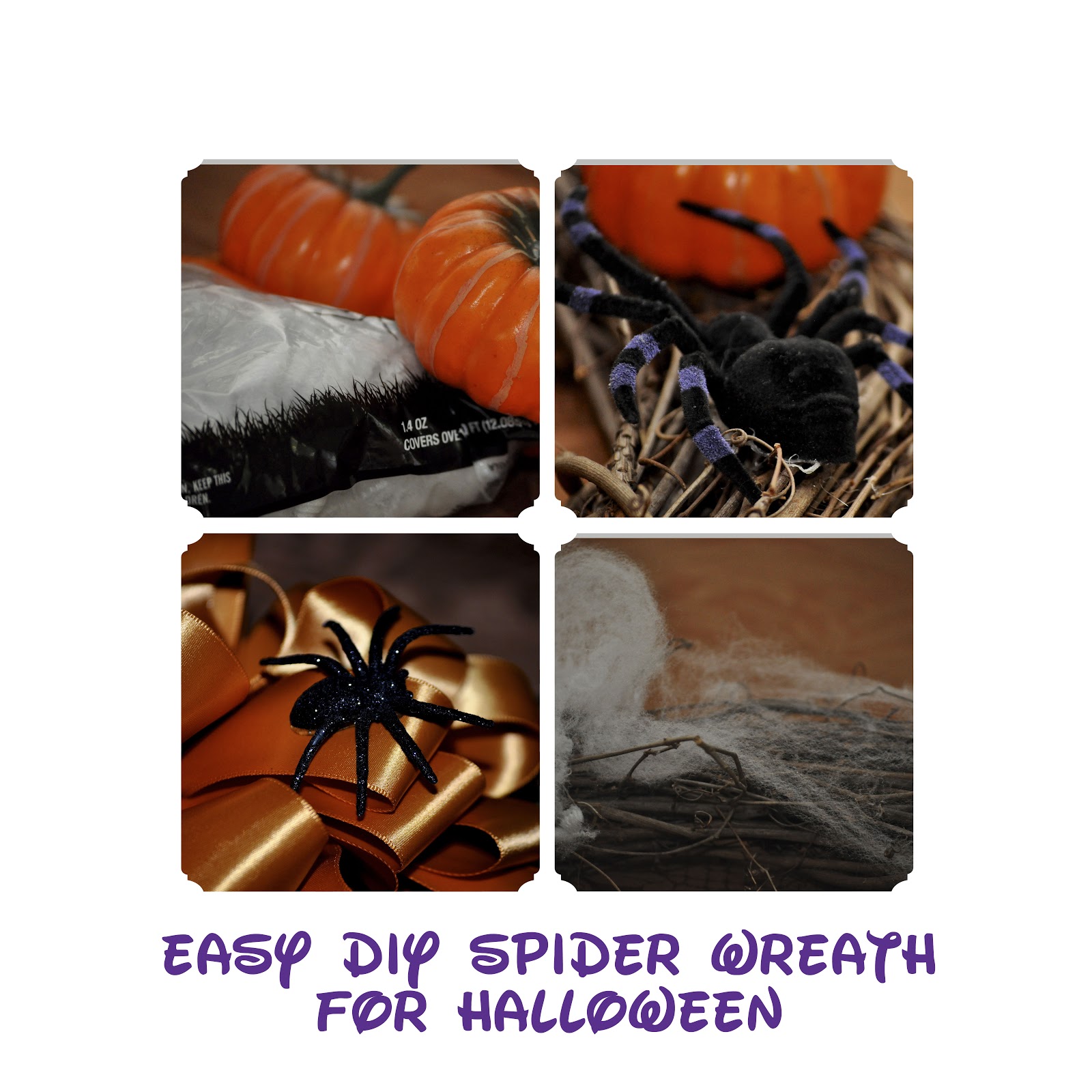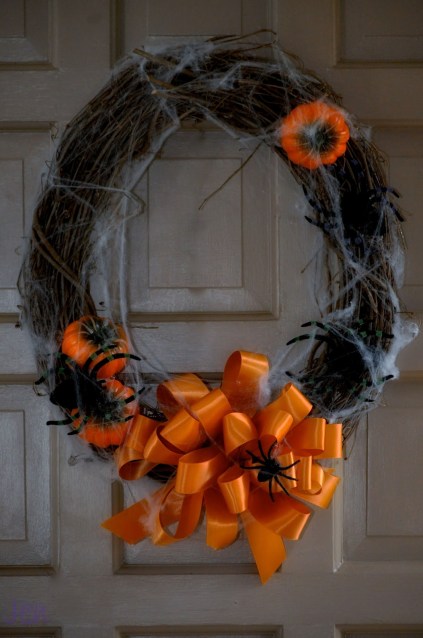 I attached the pumpkins and spiders using hot glue, then cut off a bit of the fake spider webbing to stretch across the wreath to complete the effect.