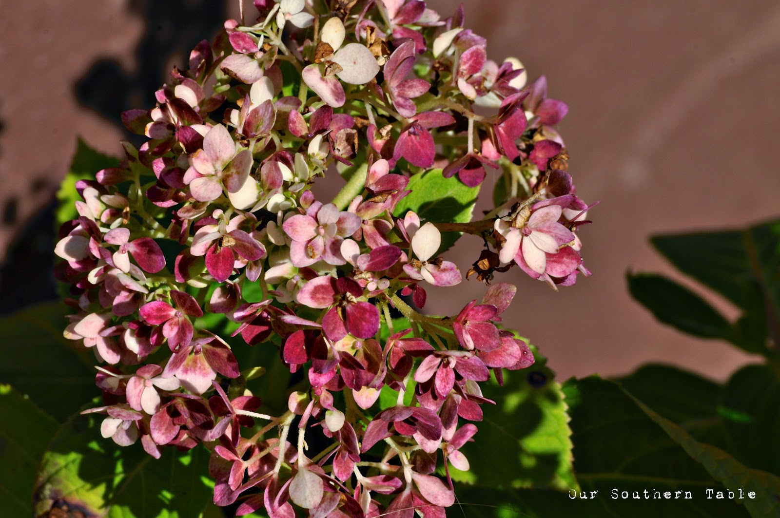 | I love the color of my normally blue hydrangea shrubs; even they are changing for the fall. |