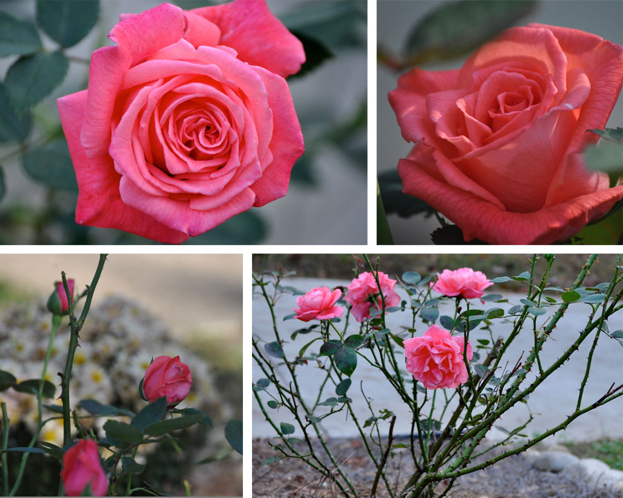 | Coral running roses next to our chimney |