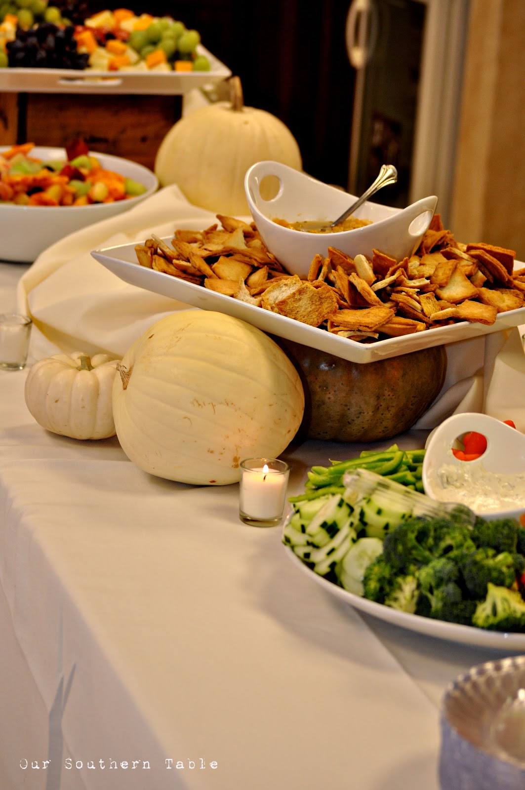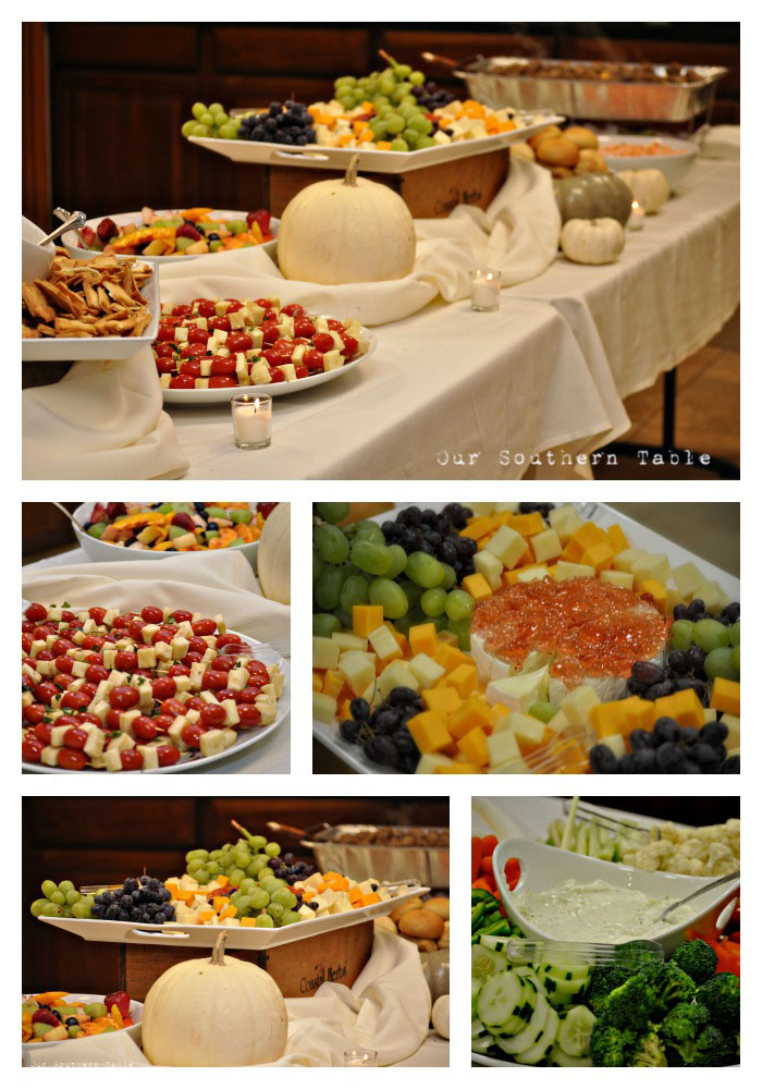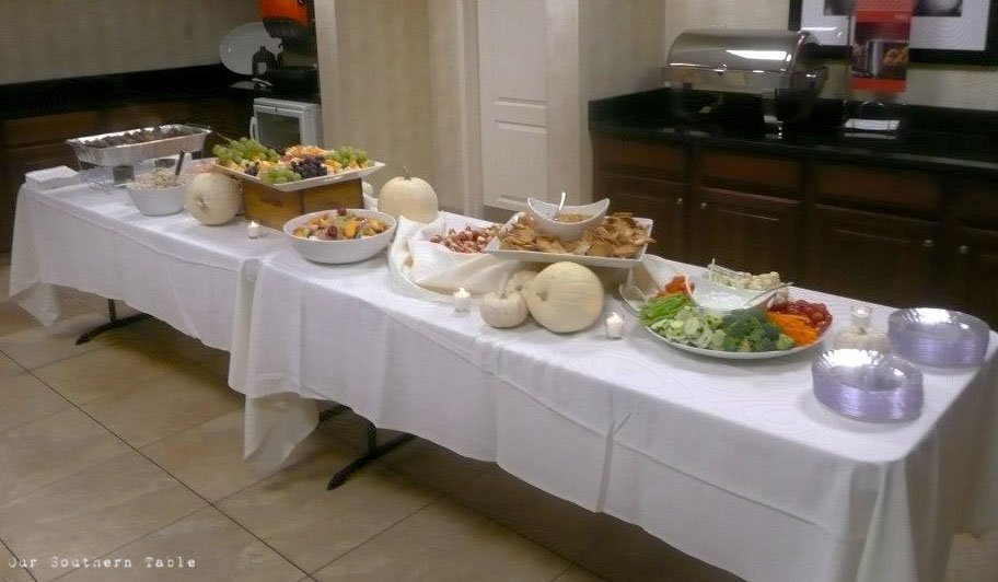Working within my budget, for the buffet I used mostly white and a couple of blue pumpkins for accents, then scattered tea lights down the table. The hotel provided all of the linens and tables for our use. I elevated some of my platters to create a little character.