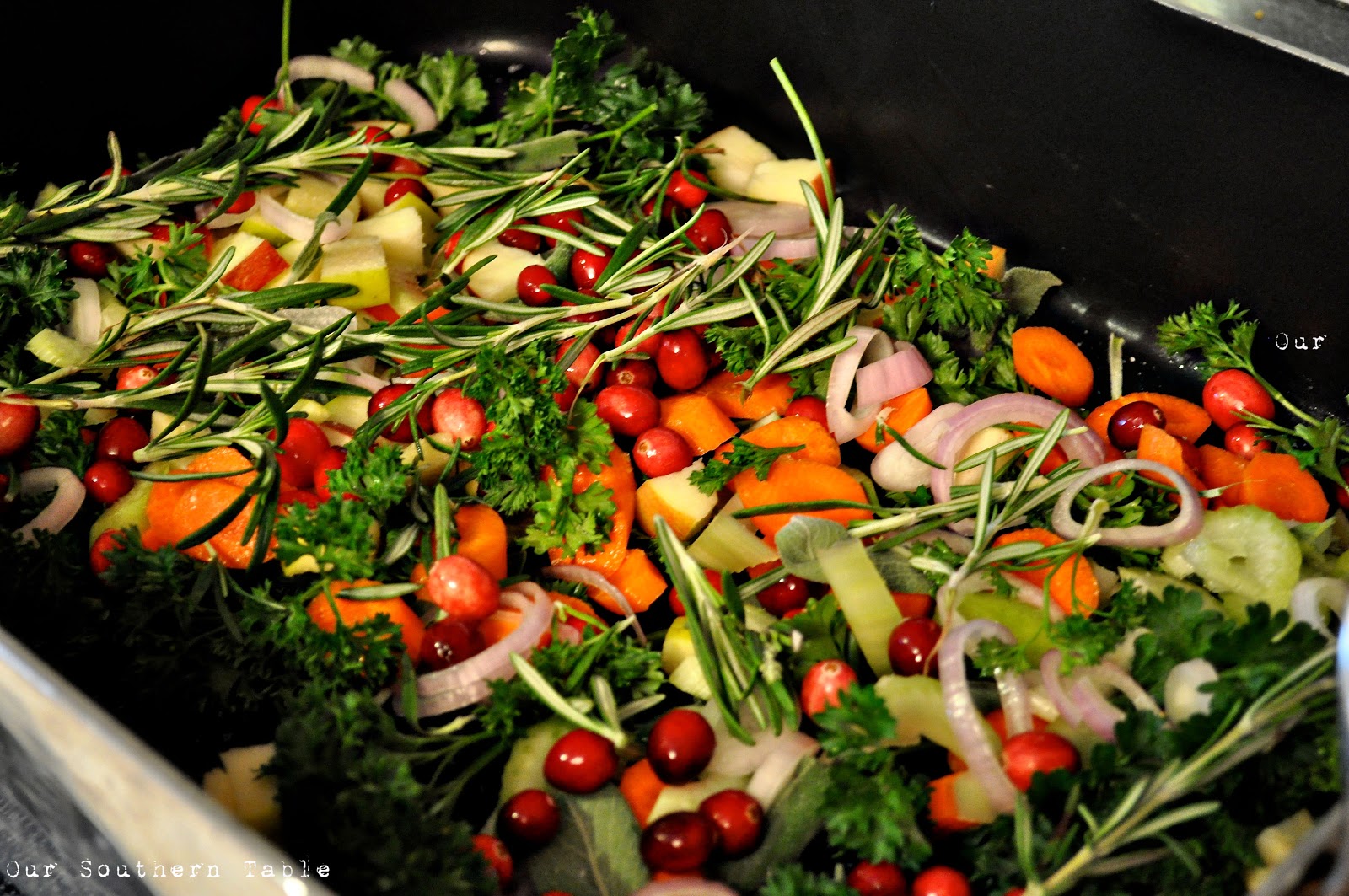 **Using your freshly chopped vegetables and herbs, make a “bed” in the bottom of your roasting pan for your turkey to rest on, saving some of the vegetables, herbs, and fruit to stuff the bird.