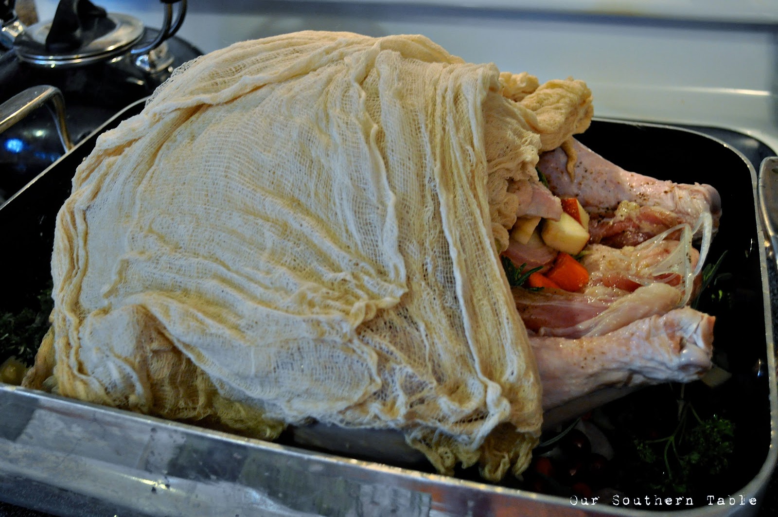 **In a large bowl, combine the wine and chicken broth. Unfold your cheesecloth, keeping it layered, but leaving a large enough piece to cover your turkey. Soak the cheesecloth in the wine mixture, to thoroughly wet it. Carefully remove the cheesecloth from the wine/broth mixture and lay it over the turkey. Don’t squeeze the cheesecloth.