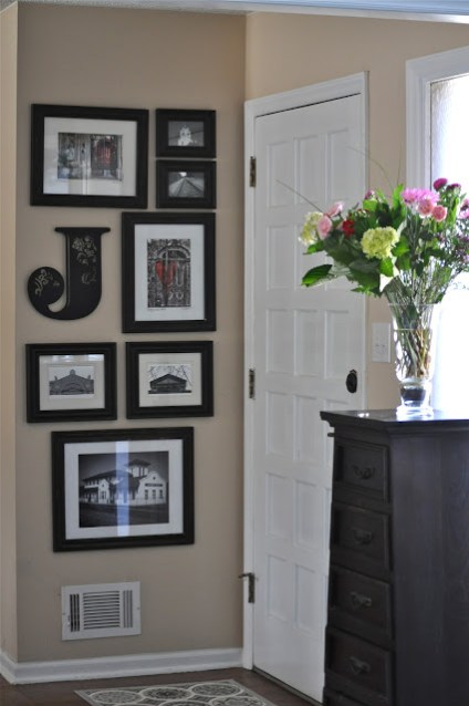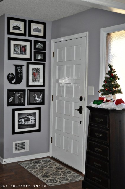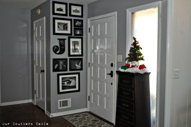 And here is my gallery wall (as narrow as it is) updated with our new wall color….. “sparrow” by Behr from Home Depot.