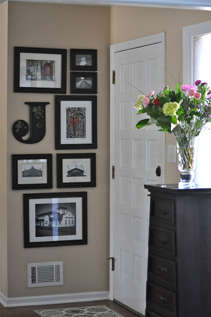 As we finished painting the dining room, which runs right into our entryway, I updated my gallery wall just a little by taking it on up to the ceiling. The black frames (while slightly different from one another) really go well together as they all are matted the same and hold black and white photos.