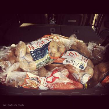 **Bought 230 pounds of potatoes (which are sitting in my den making the room smell like a cellar) that I will be scrubbing and wrapping today so that they are ready to bake on Sunday morning.