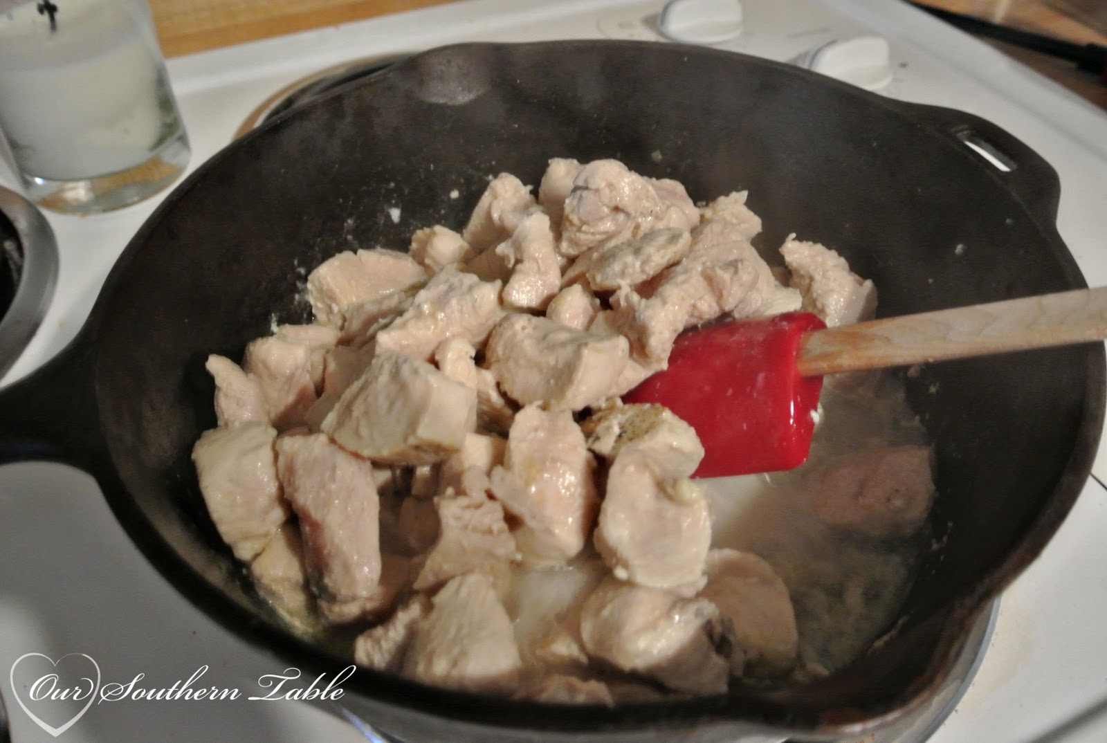 In a large skillet or cast iron Dutch over, heat 2 Tablespoons of olive oil over medium-high heat. Cook your diced chicken about five minutes, turning while cooking so that you have it evenly cooked.