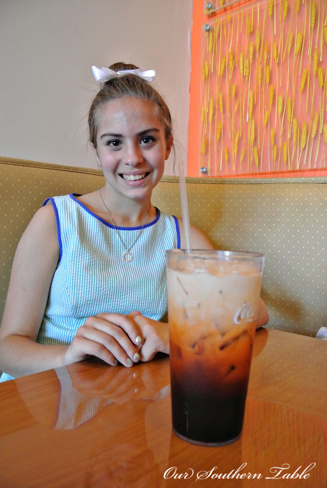 Madeline started off her lunch with Thai tea which is a strong iced tea with cream.