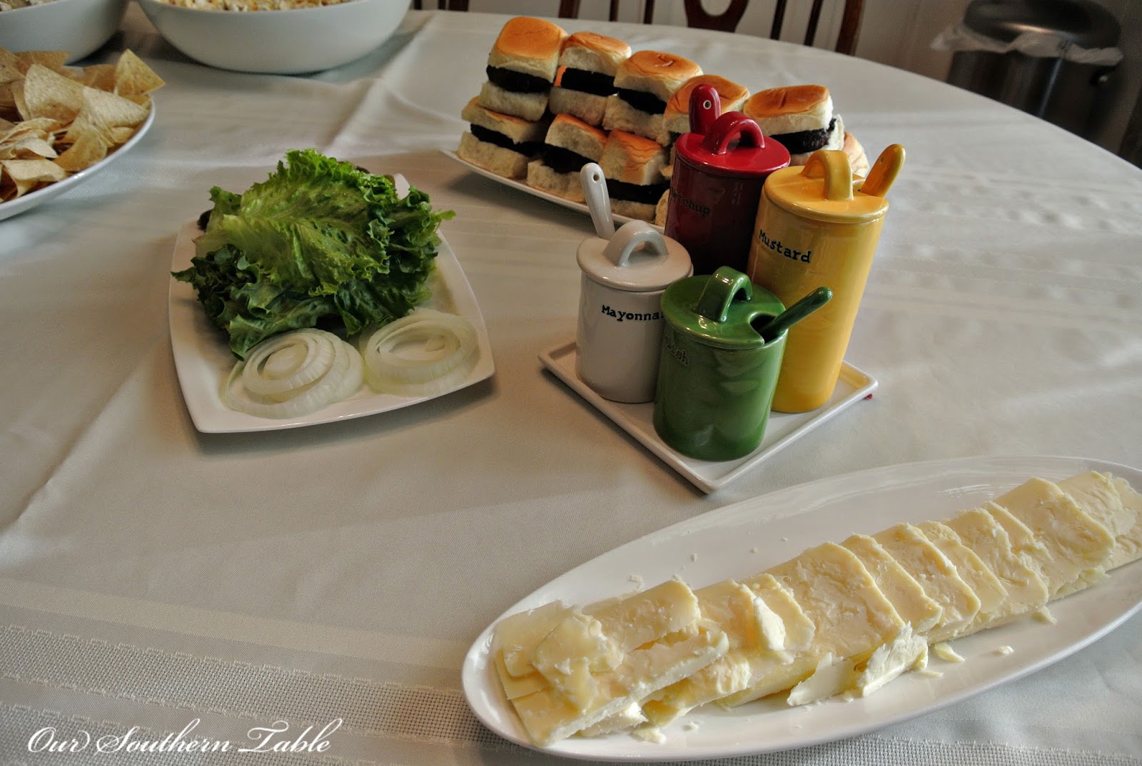 Dinner was was simple sliders with traditional burger toppings, baked beans, chips & salsa.