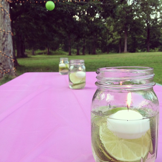 Colored tablecloths and simple centerpieces of floating candles & lime slices in Mason jars completed the space.